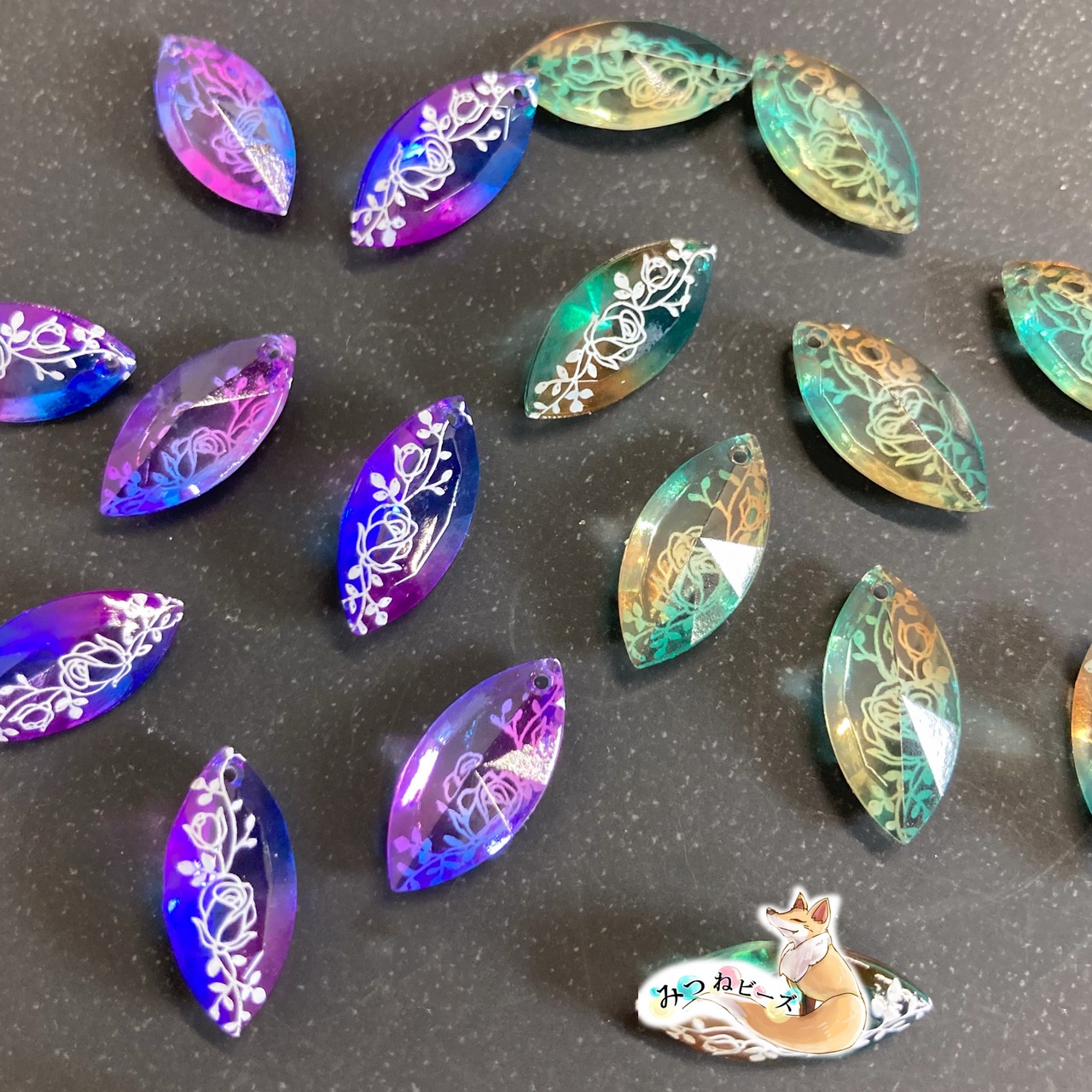 市販ではあまり出回っていないマーキス型の小ぶりチャームにクリアカラーの2色で色付け