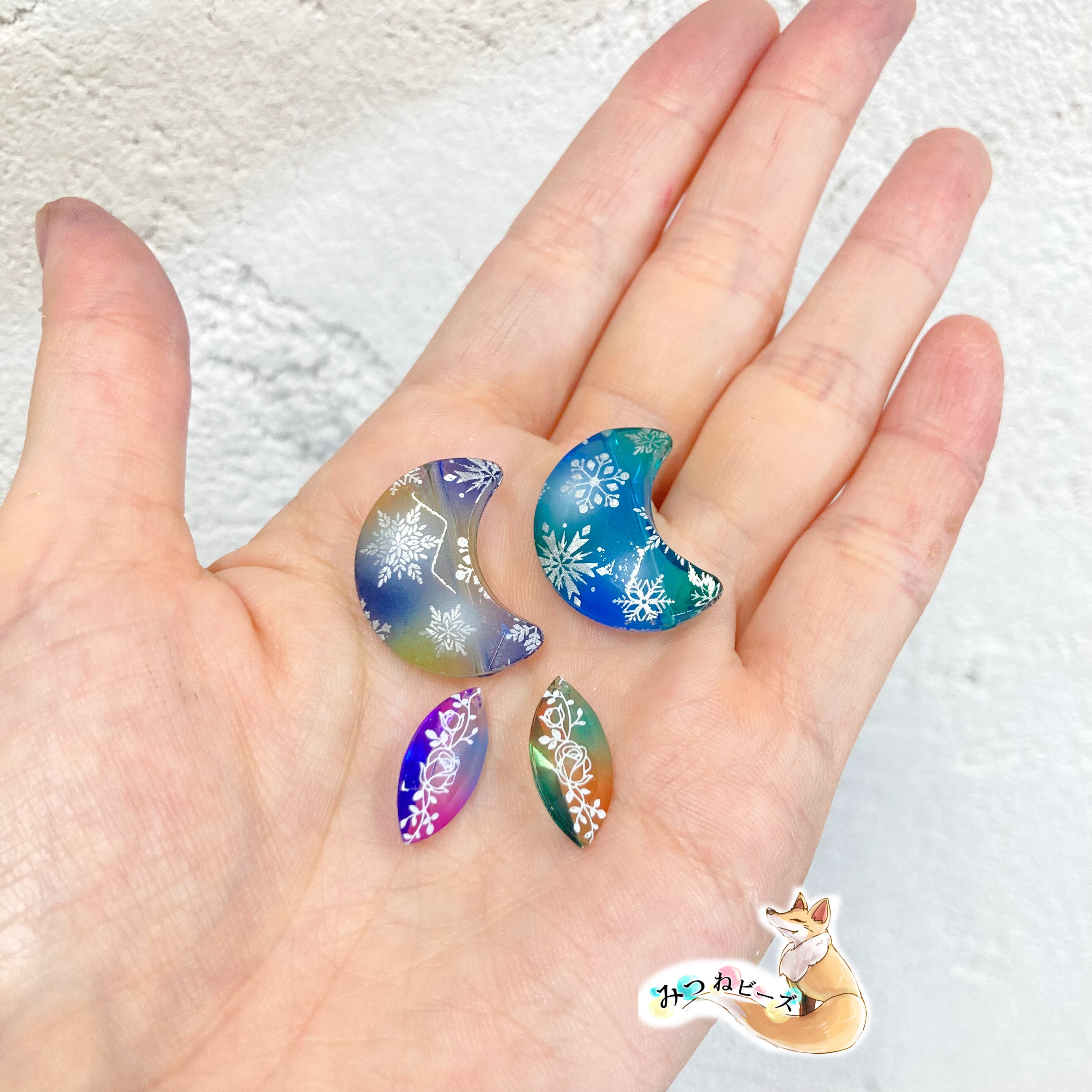小ぶりな月型のビーズに2カラーで色付けし、ふんわりとホワイトで着色して雪柄をのせました。