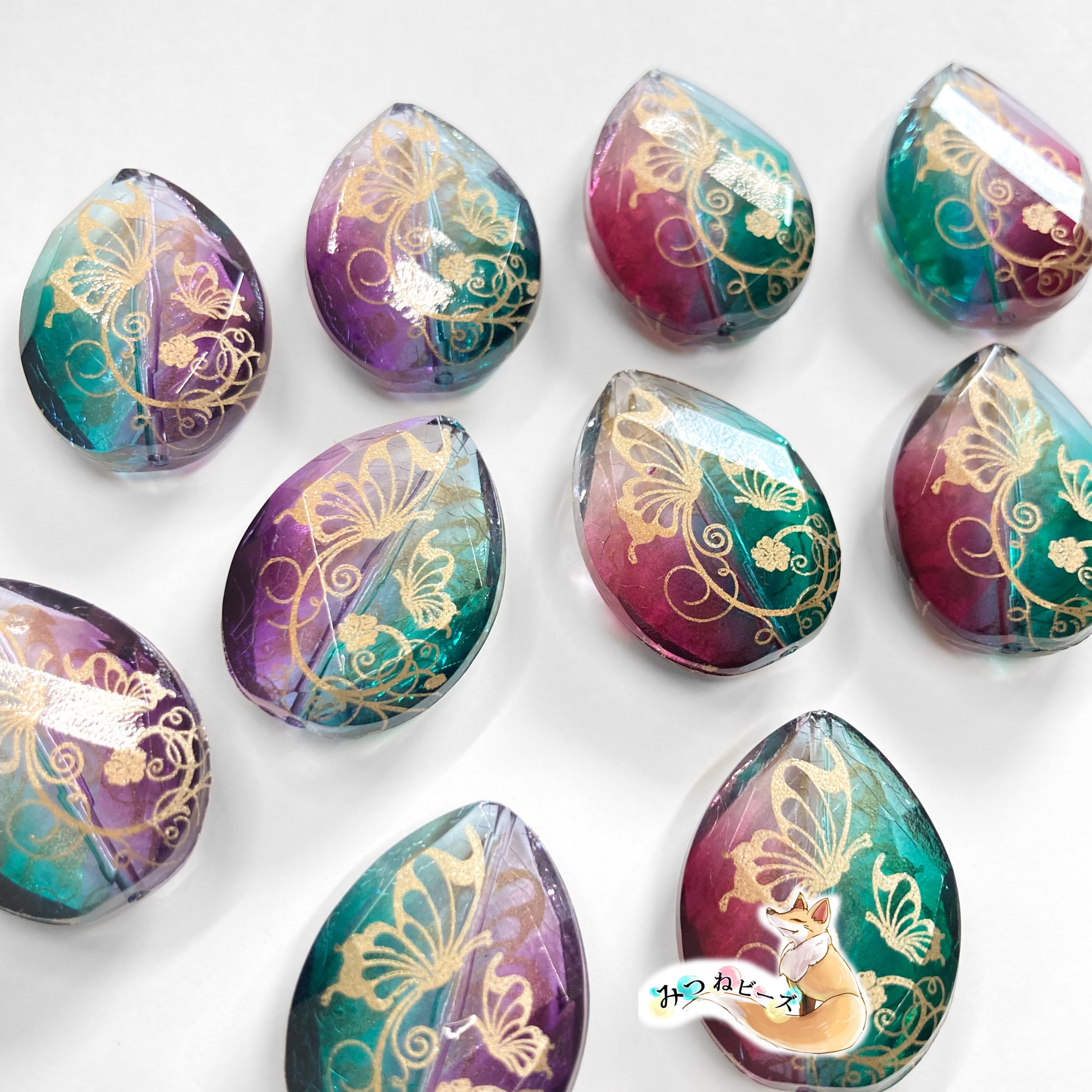 ひねりのきいた大ぶりなしずく型のビーズに深い2カラーで色付け、両面に大柄の蝶の模様をつけました。