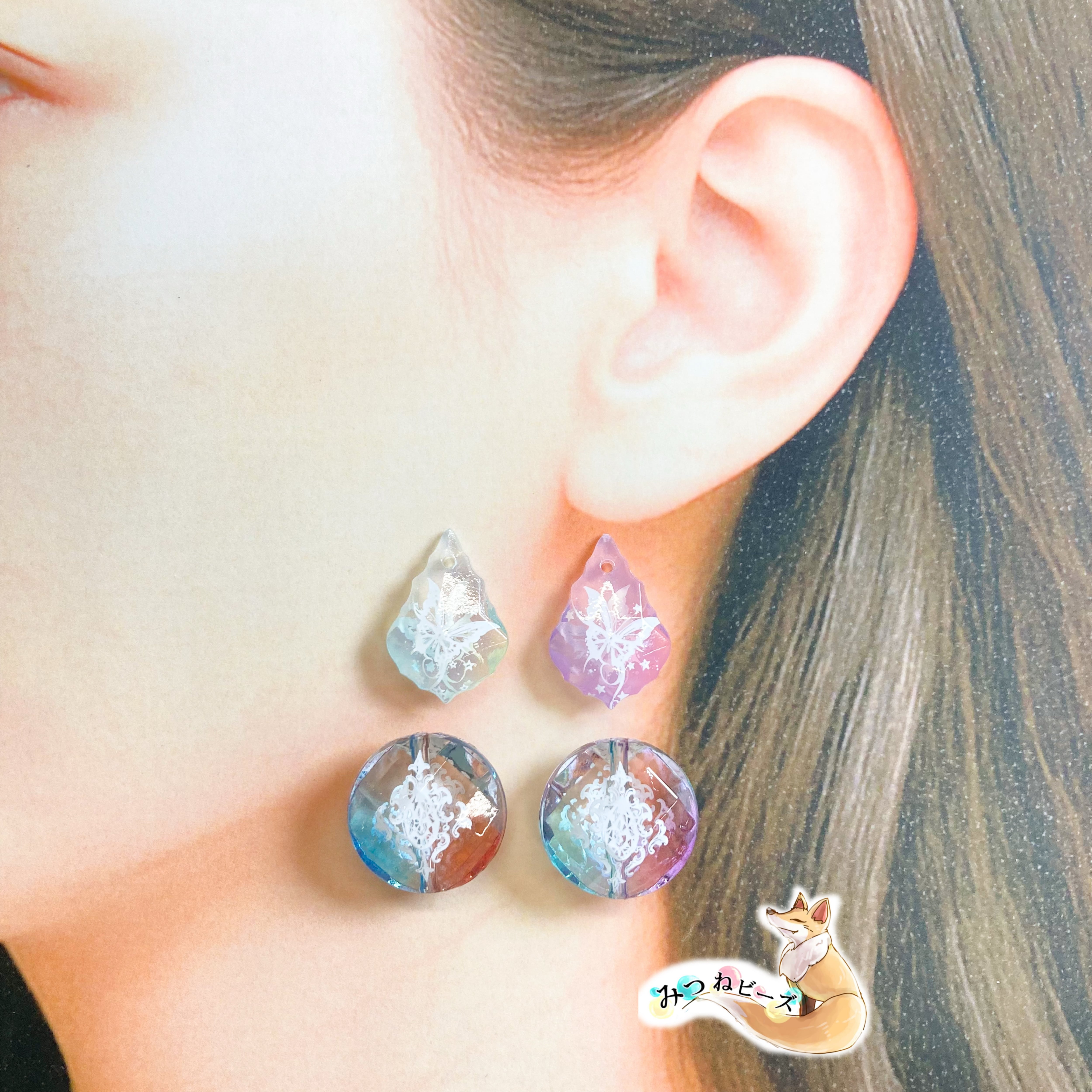 人気のリーフ型チャームにミルキーカラーの2色で色付け可憐な蝶の柄を両面につけました