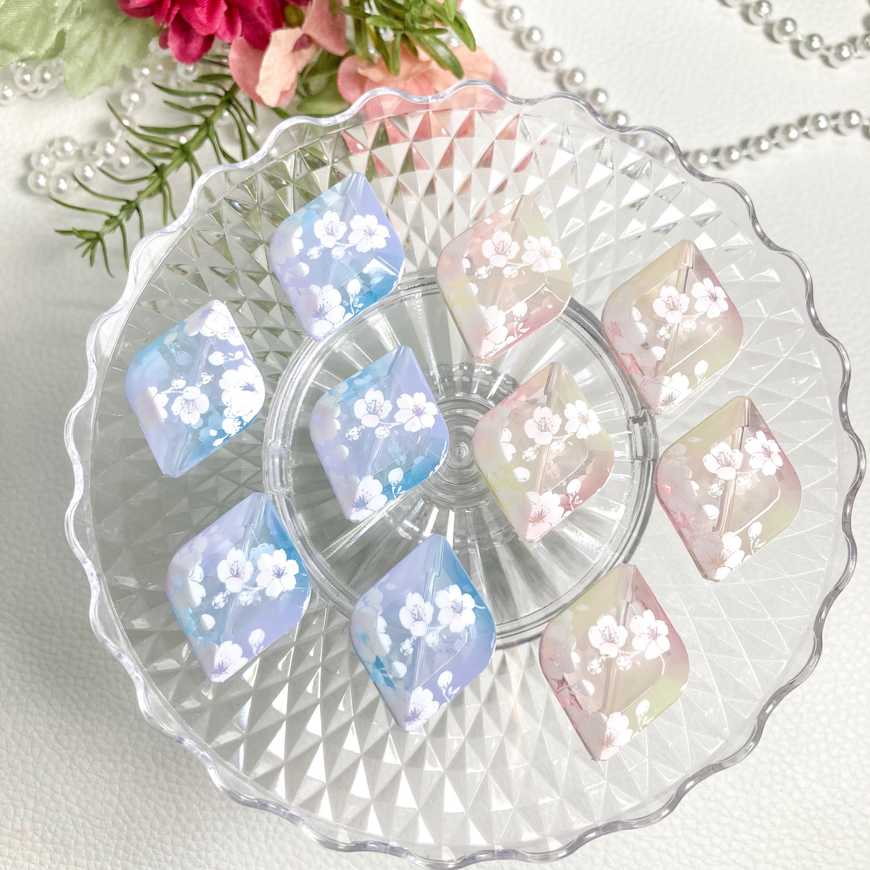 透けてはっきりと発色するクリアなカラーで着色し、ほんのり色付けた桜柄をつけ愛らしく仕上げました